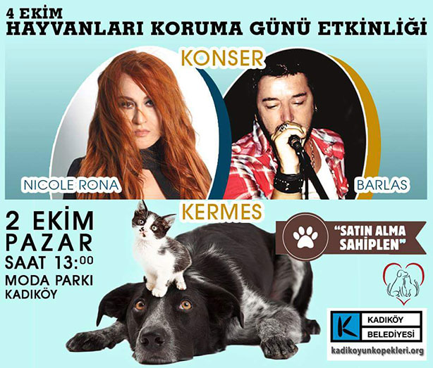 Hayvanları Koruma Gününü sevgili Nicole Rona ve Barlas Erinç'in vereceği konser, devamında çeşitli etkinliklerimiz ile kutluyoruz. Satın alma sahiplen sloganımızla bakımevimizdeki dostlarımızın yuva sahibi olmalarına dikkat çekmek istiyoruz. Etkinlik herkese açıktır. 2 Ekim pazar günü Moda Parkı saat 13:00’te bekliyoruz |