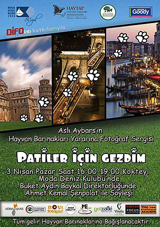 Pek çok hayvansever kişi ve kuruluşu buluşturacak olan “Patiler İçin Gezdim” sergisi 20 Mart Pazar günü 17.00-19.00 arasında düzenlenecek renkli bir açılış kokteyli eşliğinde hayata geçecek. Serginin ziyaretçileri dünyanın farklı bölgelerinde çekilmiş çarpıcı fotoğrafların keyfini çıkartırken, sahipsiz sokak hayvanlarının daha iyi bir yaşama kavuşmasına da katkıda bulunacaklar.